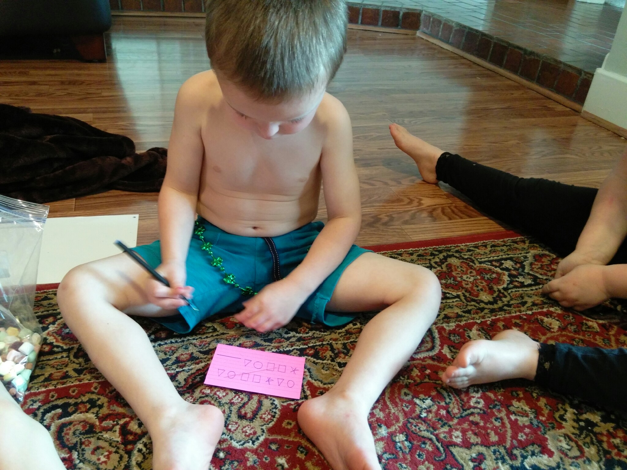 To Play: Place index cards face down and have your child choose one. If they are able to read the word on the card and answer a related question, which you can make up on the spot and tailor to their age and ability, they can pick one treat out of the bag. For example, if your child picked up a “What” card, you might ask them “What is 2 + 2?” but you might also ask “What is your favorite kind of ice cream?” If your child selected “Which” you might say “Which of these is a circle?” while drawing three shapes or you might say “Which of these shapes comes next in the pattern?” while drawing a pattern of shapes out onto the scrap paper. In our house, if they pick a ‘Why’ card they can ask me any question starting with why and if I don’t know the answer we look it up on my phone or the computer. Come on, do you know why St. Patrick’s Day is on March 17th?